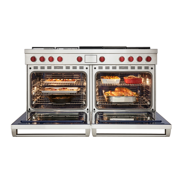 Цветной сенсорный экран интуитивно понятен и удобен. По окончании работы он незаметно скрывается на лицевой панели. Переключатели управления со светодиодной подсветкой загораются при использовании, указывая, какие горелки активны. Духовые шкафы имеют функции самоочистки (пиролиза), отложенного старта, готовки по расписанию и опцию «Шаббат». Внутри они покрыты синим фарфором, устойчивым к температурному и механическому воздействиям, массивные дверцы легко и плавно открываются благодаря гидравлическому механизму.
