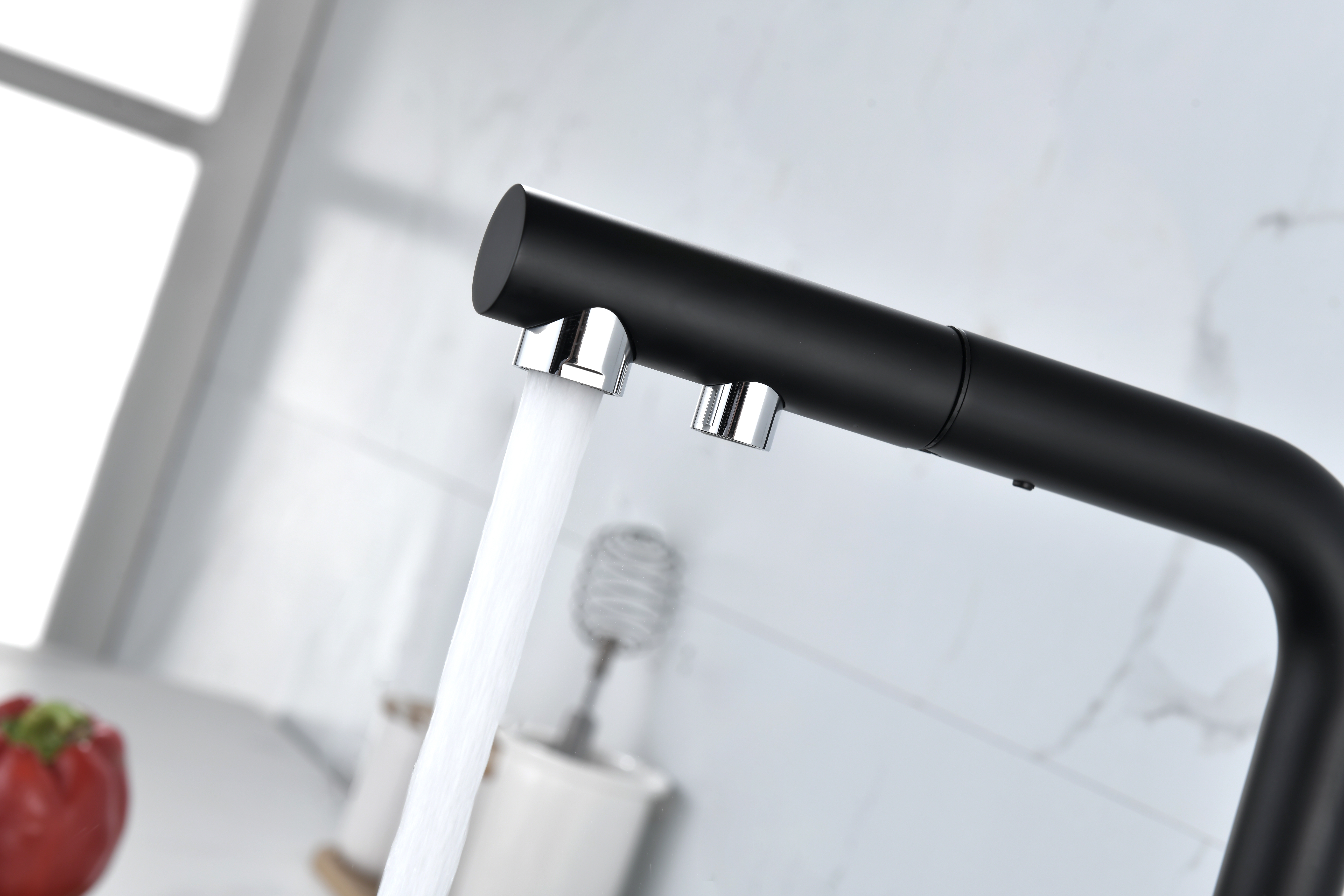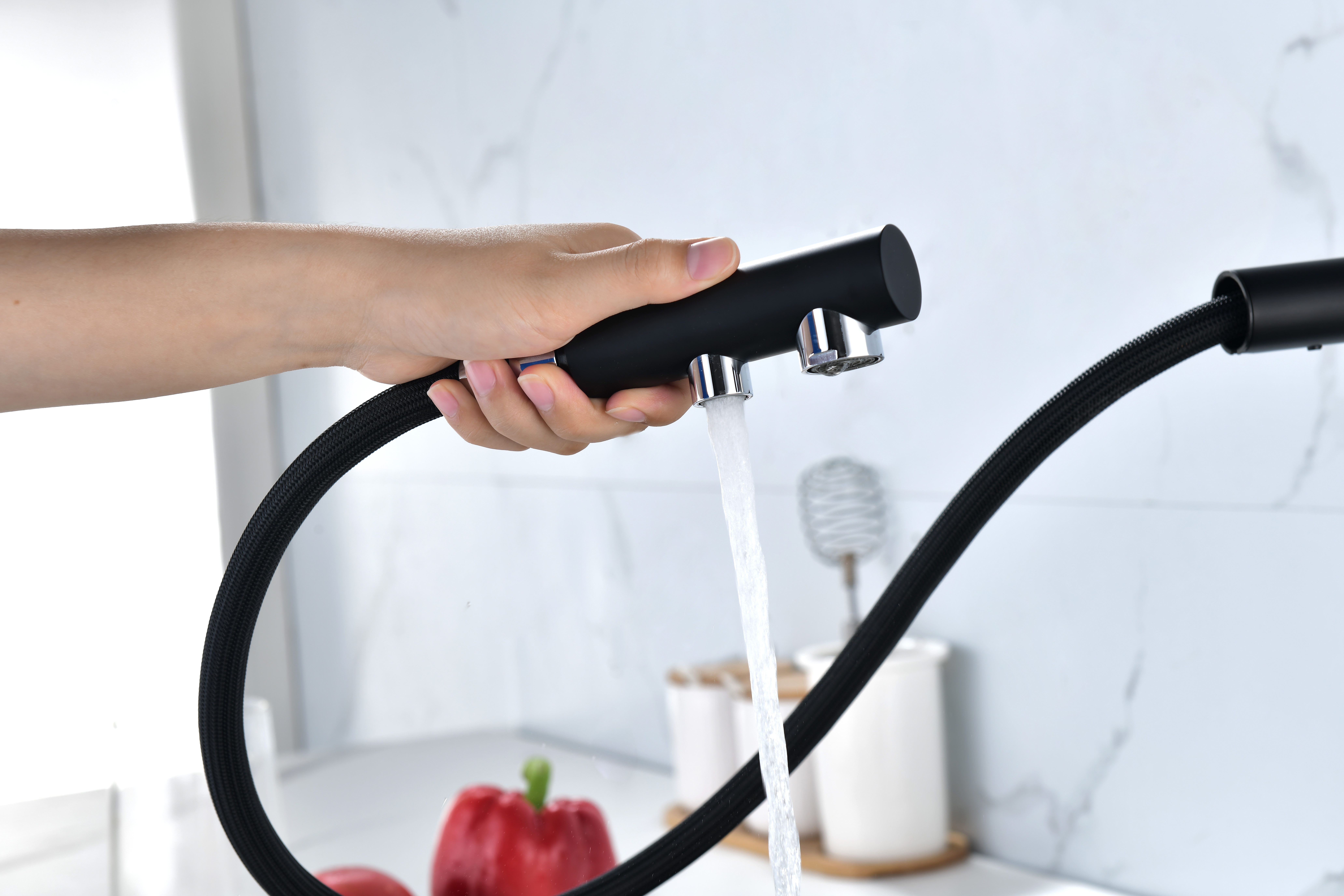 Смеситель оснащен гибким выдвижным изливом из нейлоновой оплетки, которая обладает отличной устойчивостью к истиранию и разрушению. Данная техническая особенность расширяет рабочую зону смесителя, позволяя пользоваться им с удобством в больших мойках, мойках с двумя чашами, или наполнять водой ёмкость на столе рядом с мойкой, в том числе питьевой водой.
