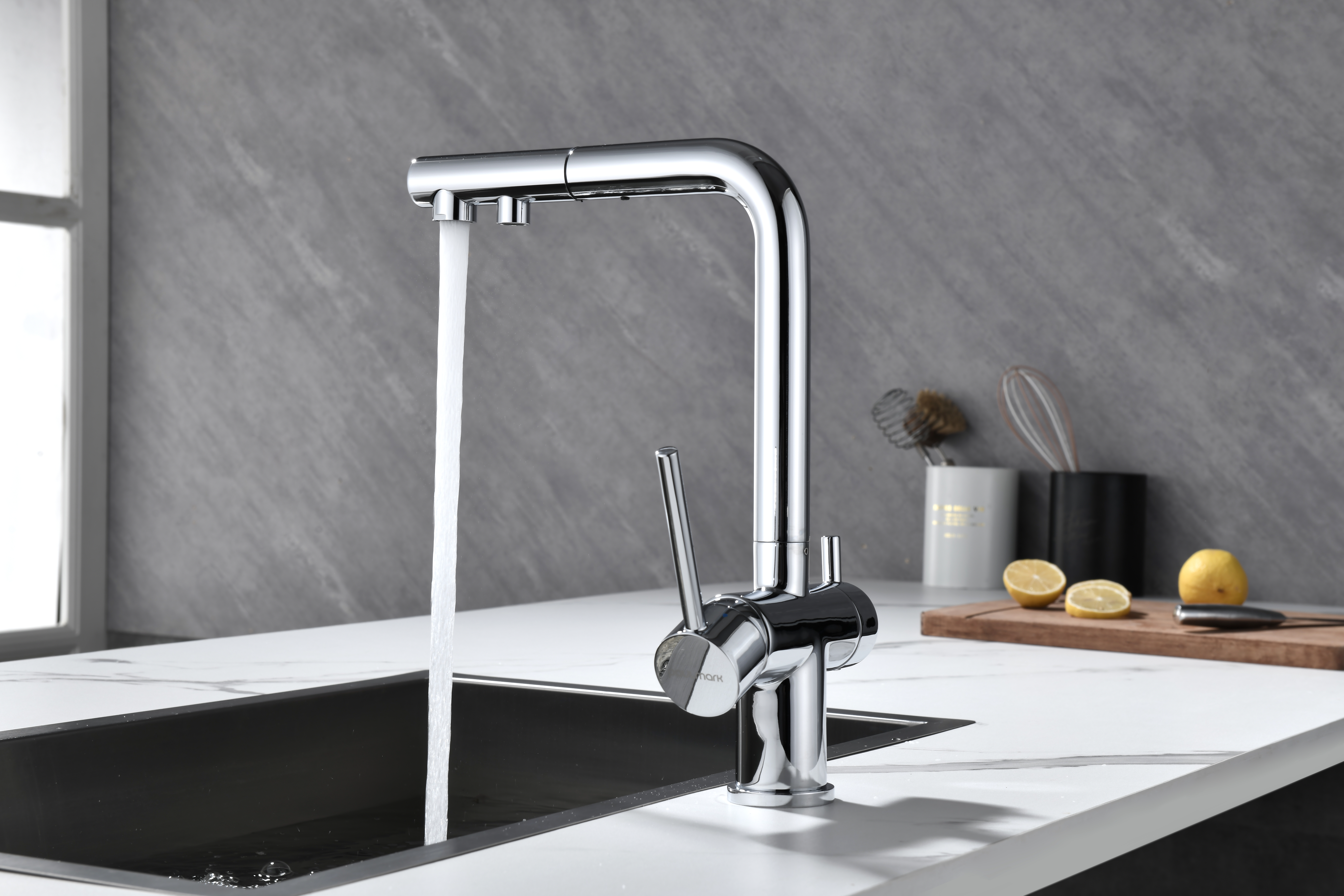Смеситель оснащен гибким выдвижным изливом из нейлоновой оплетки, которая обладает отличной устойчивостью к истиранию и разрушению. Данная техническая особенность расширяет рабочую зону смесителя, позволяя пользоваться им с удобством в больших мойках, мойках с двумя чашами, или наполнять водой ёмкость на столе рядом с мойкой, в том числе питьевой водой.